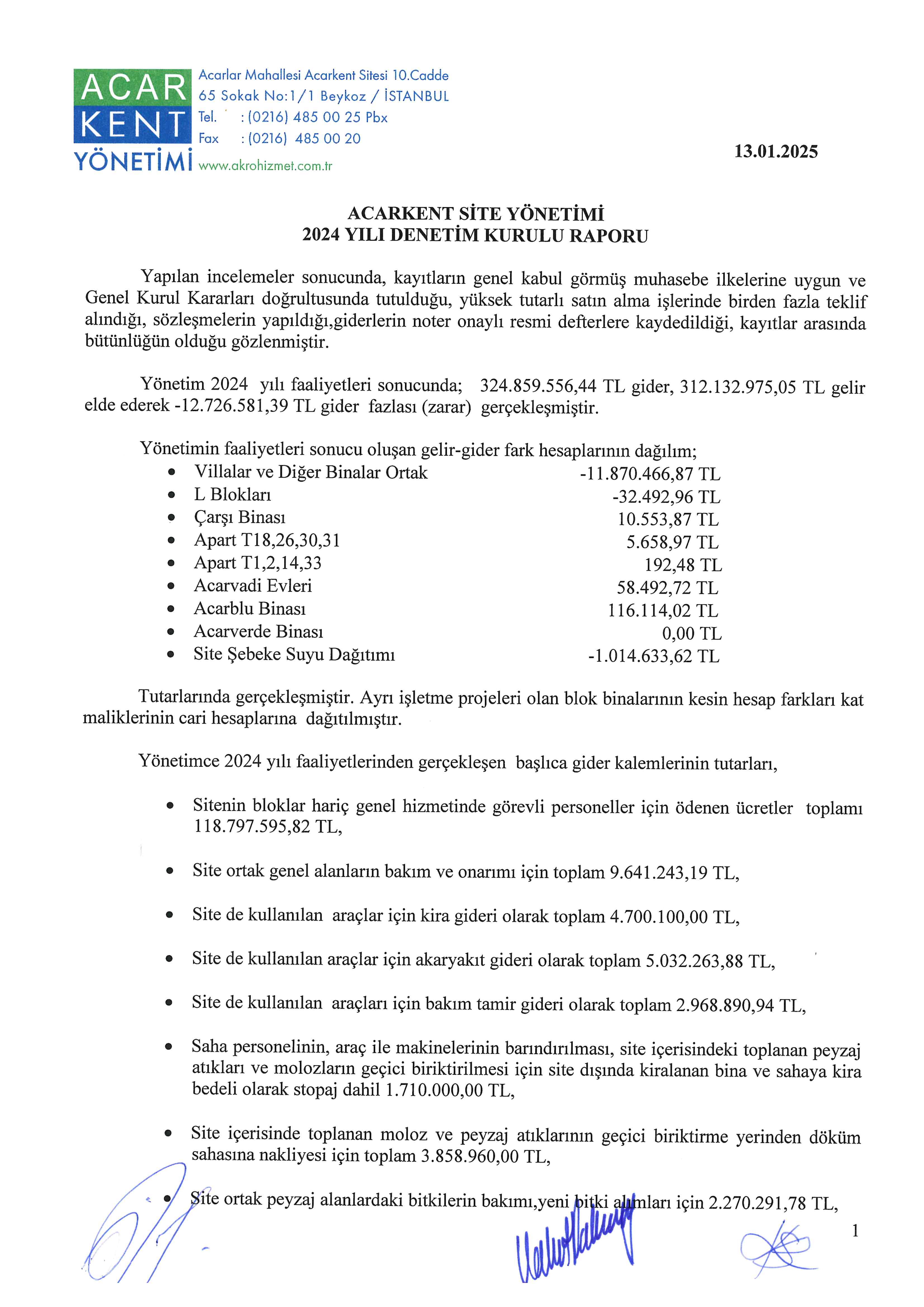 ACARKENT 2024 yılı Denetim Kurulu Raporu