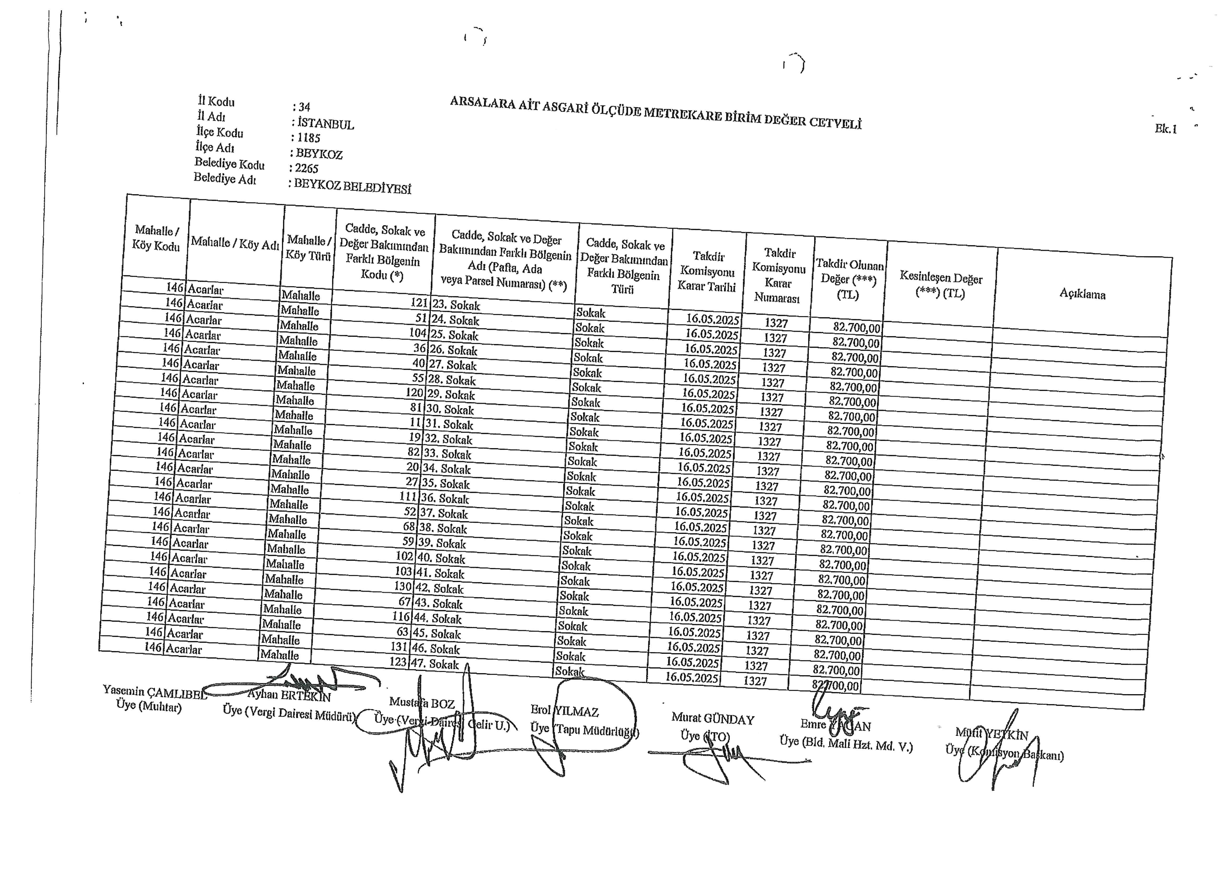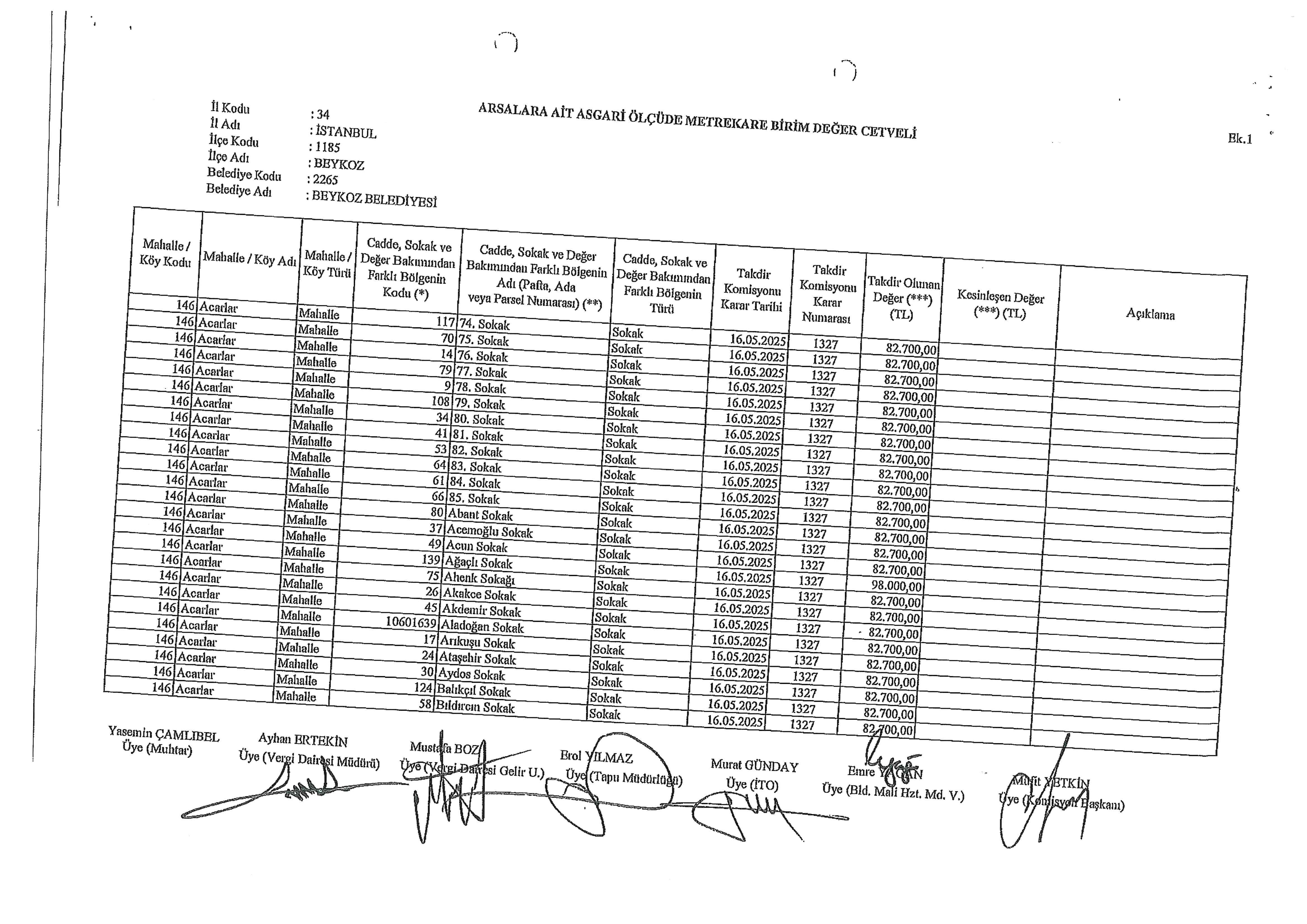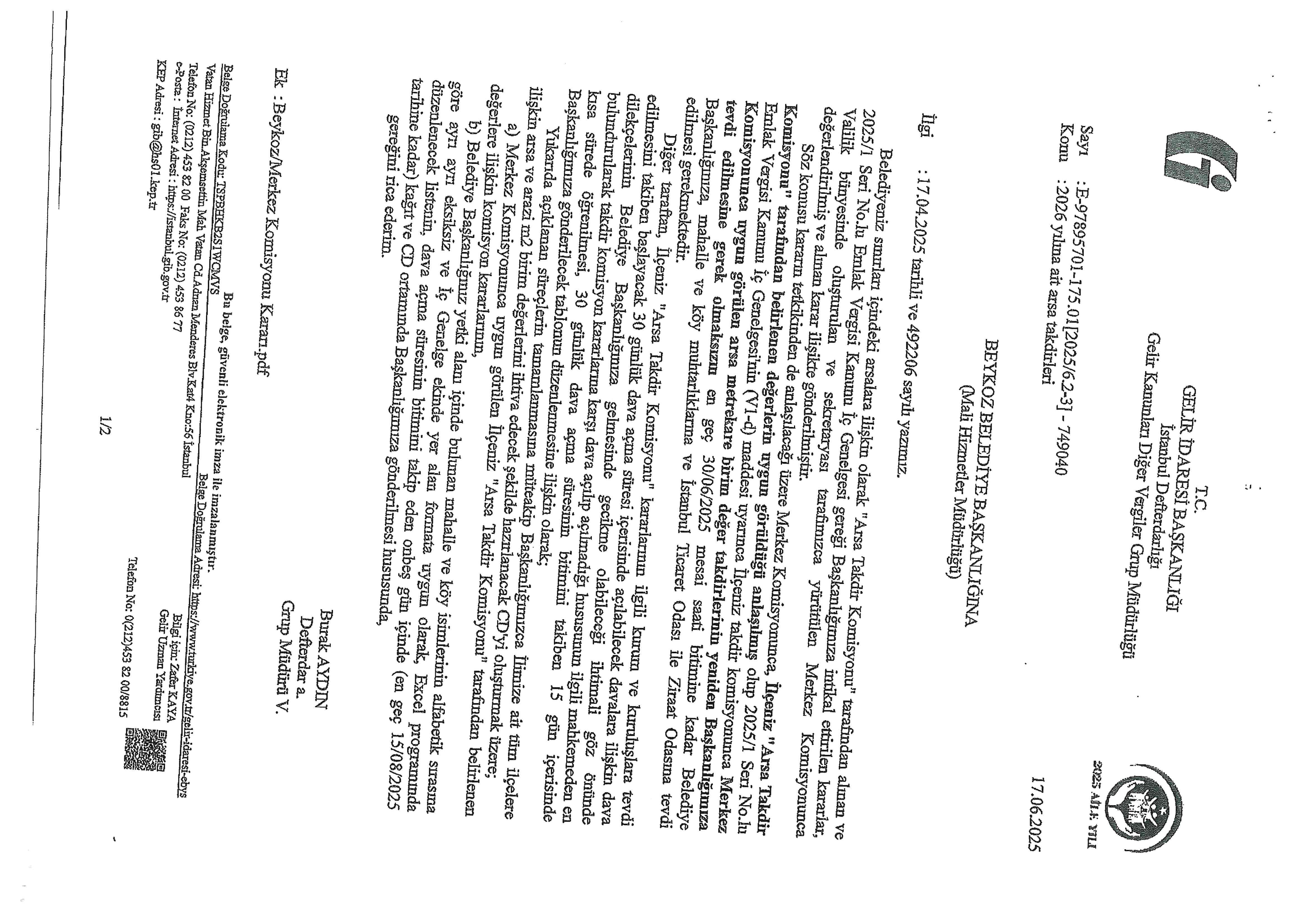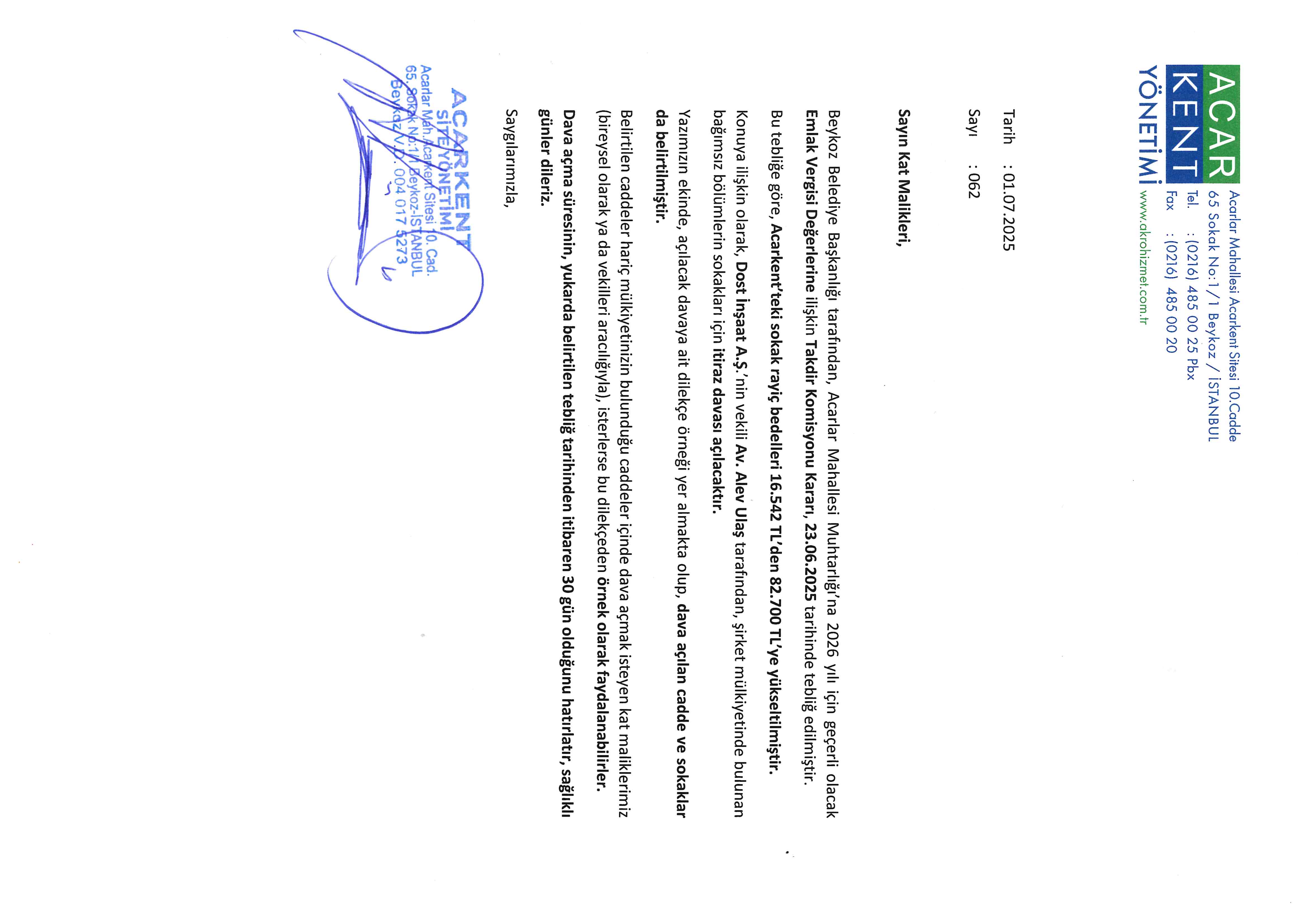 Sn. Acarkent Kat Maliki, Site Yönetimi'nin 01.07.2025 tarih, 062 sayılı "2026 Yılı Emlak Vergisi Rayiç Bedelinin Artışı" konulu yazısı ve Komisyon Kararı,